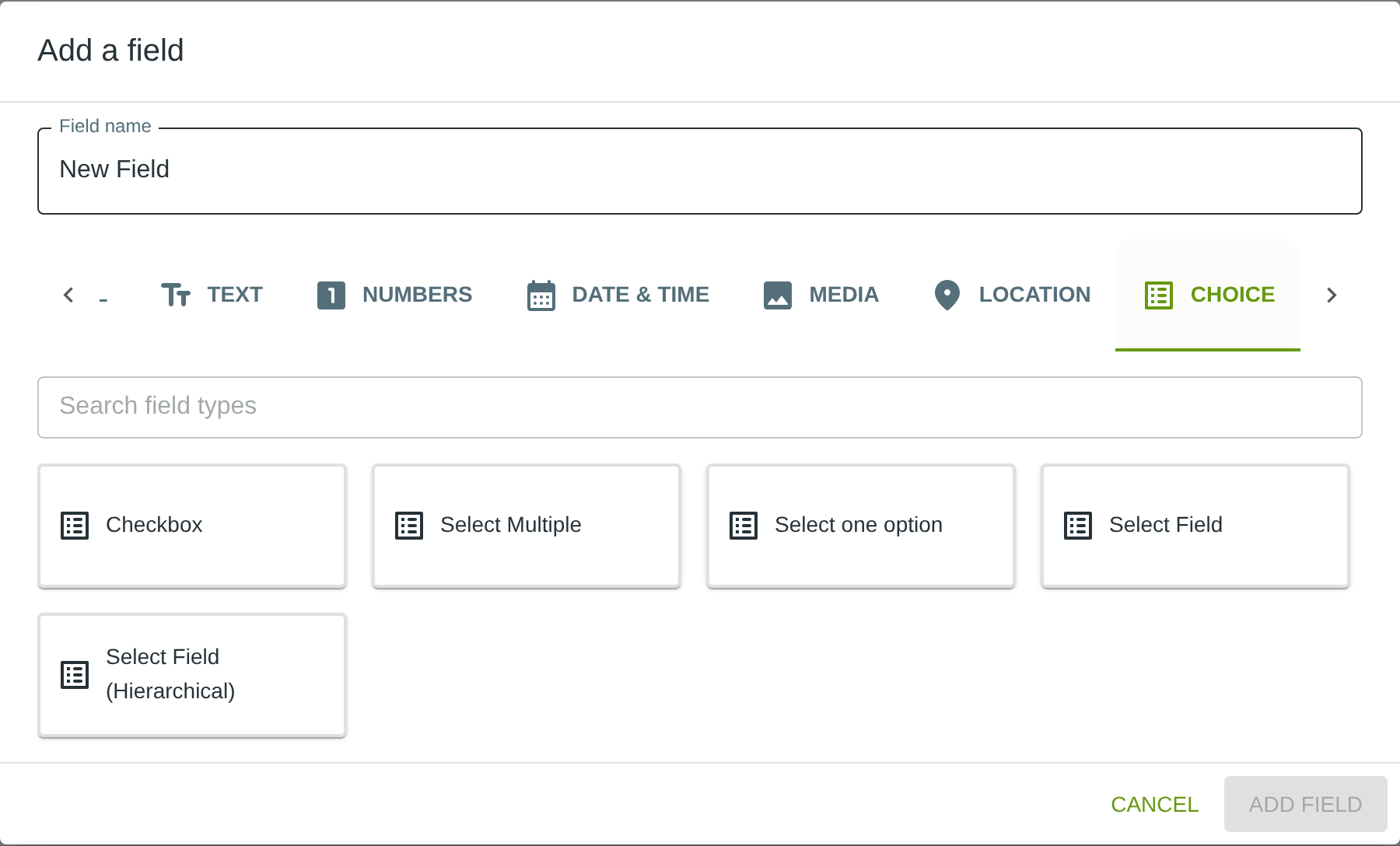 To add this field, open the ADD A FIELD dialog, navigate to the CHOICE tab, and click the Select Multiple card. Then click the ADD FIELD button in the lower right.