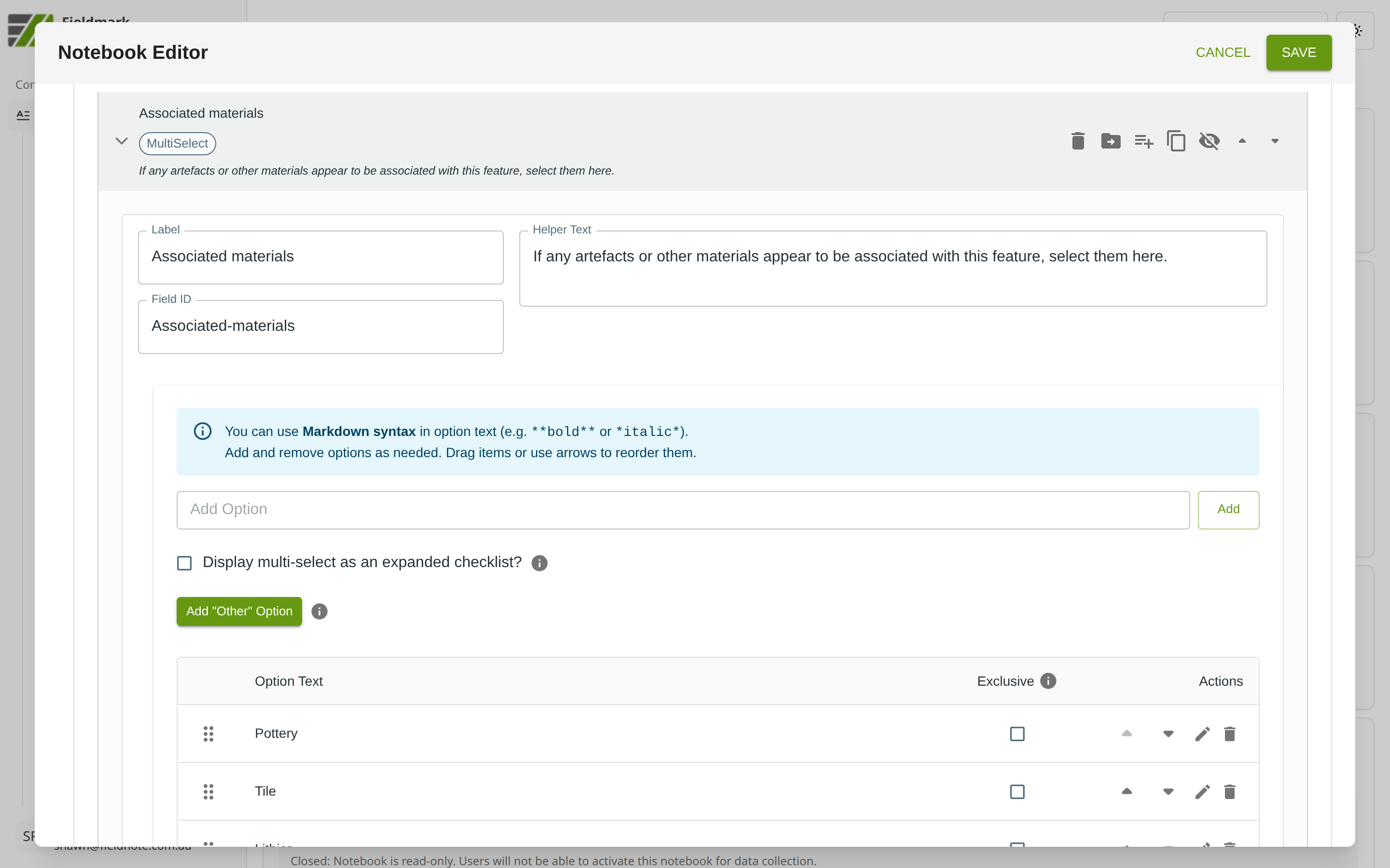 A Select Multiple field lets users pick one or more options from a list, returning an array of the selected values. It provides two display modes: an expanded checklist (where all options are visible) and a compact dropdown. By default, it displays as an expanded checklist. Use it when items are not mutually exclusive — multiple materials present, multiple features observed, multiple conditions noted simultaneously — such as “damage types”, “associated materials”, or “site formation processes”.