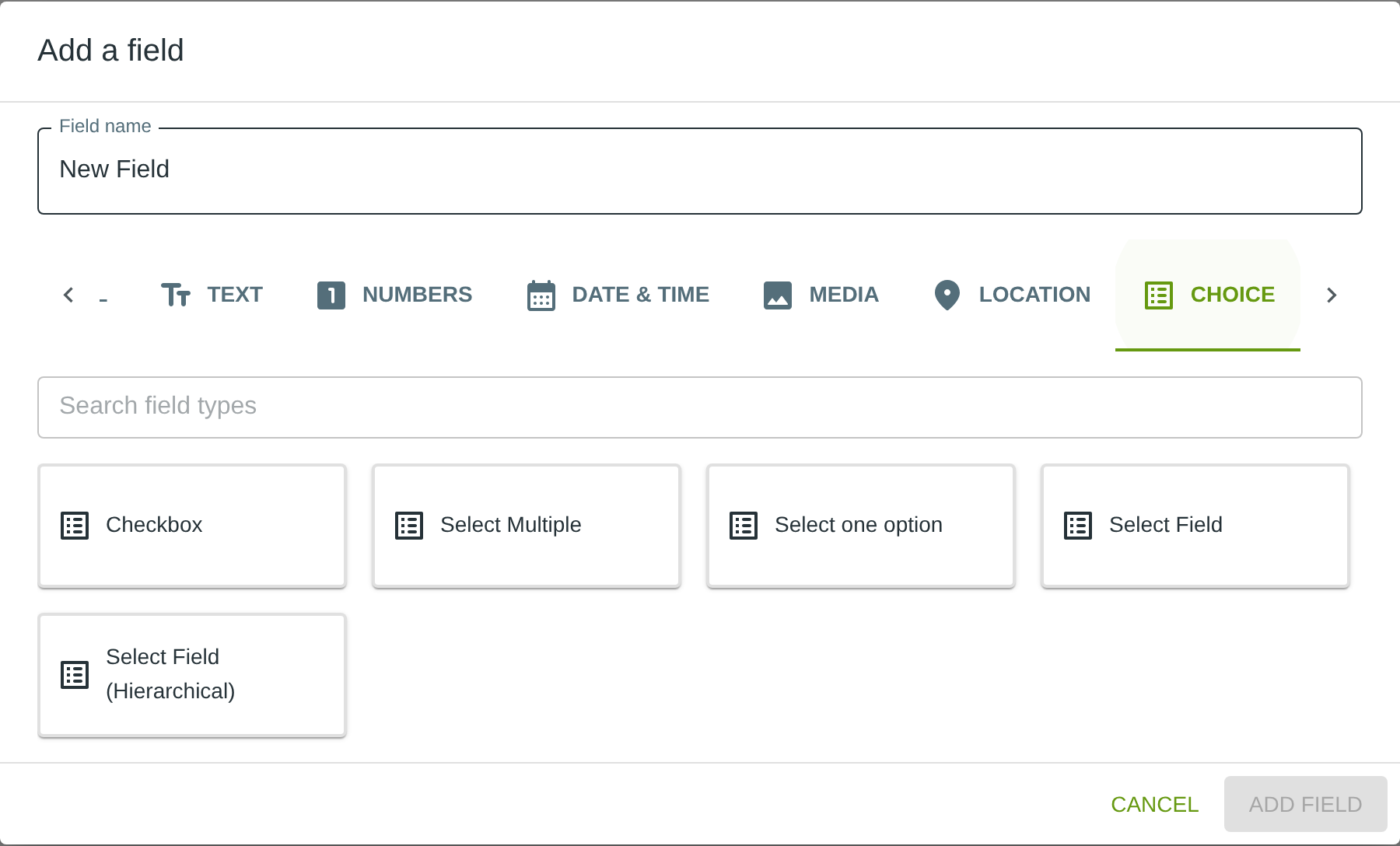 To add this field, open the ADD A FIELD dialog, navigate to the CHOICE tab, and click the Select Field card. Then click the ADD FIELD button in the lower right.