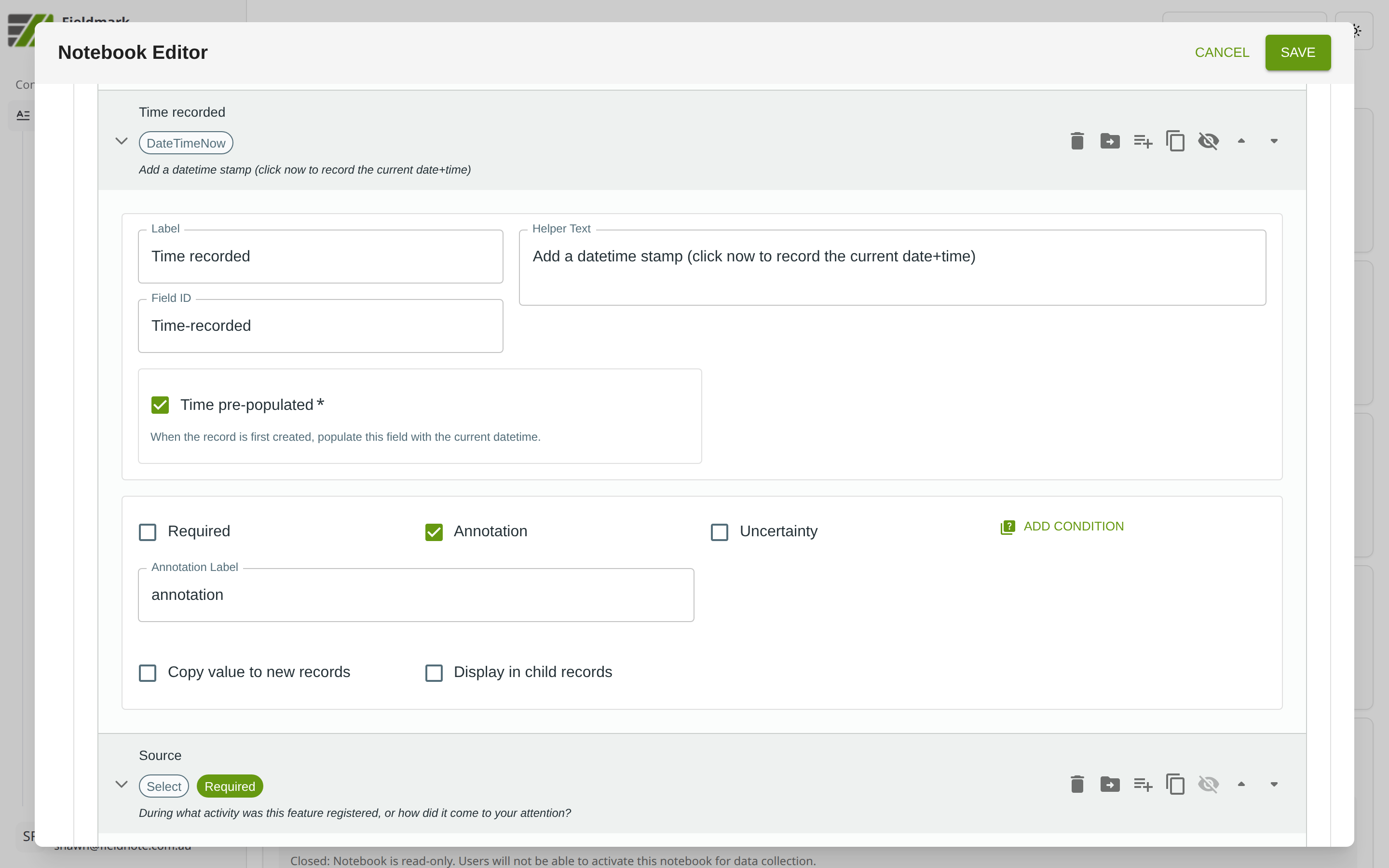 For settings shared across all field types — including Required, Annotation, Uncertainty, Conditions, Copy value to new records, and Display in child records — see Field Options.