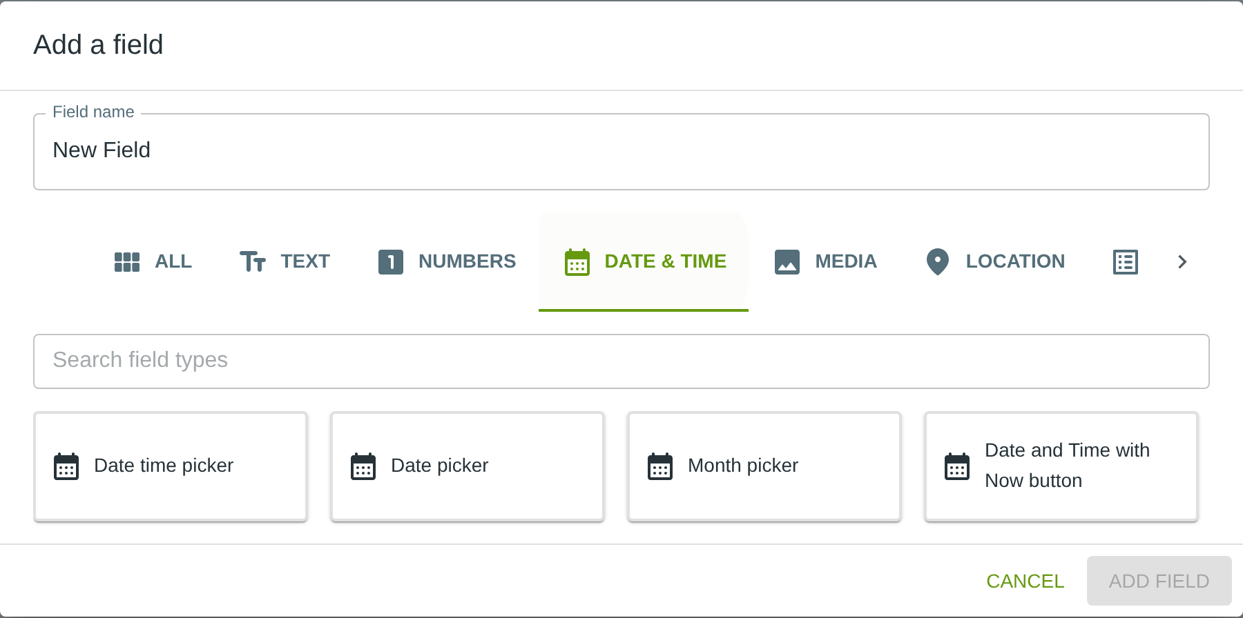 To add this field, open the ADD A FIELD dialog, navigate to the DATE & TIME tab, and click the Month picker card. Then click the ADD FIELD button in the lower right.