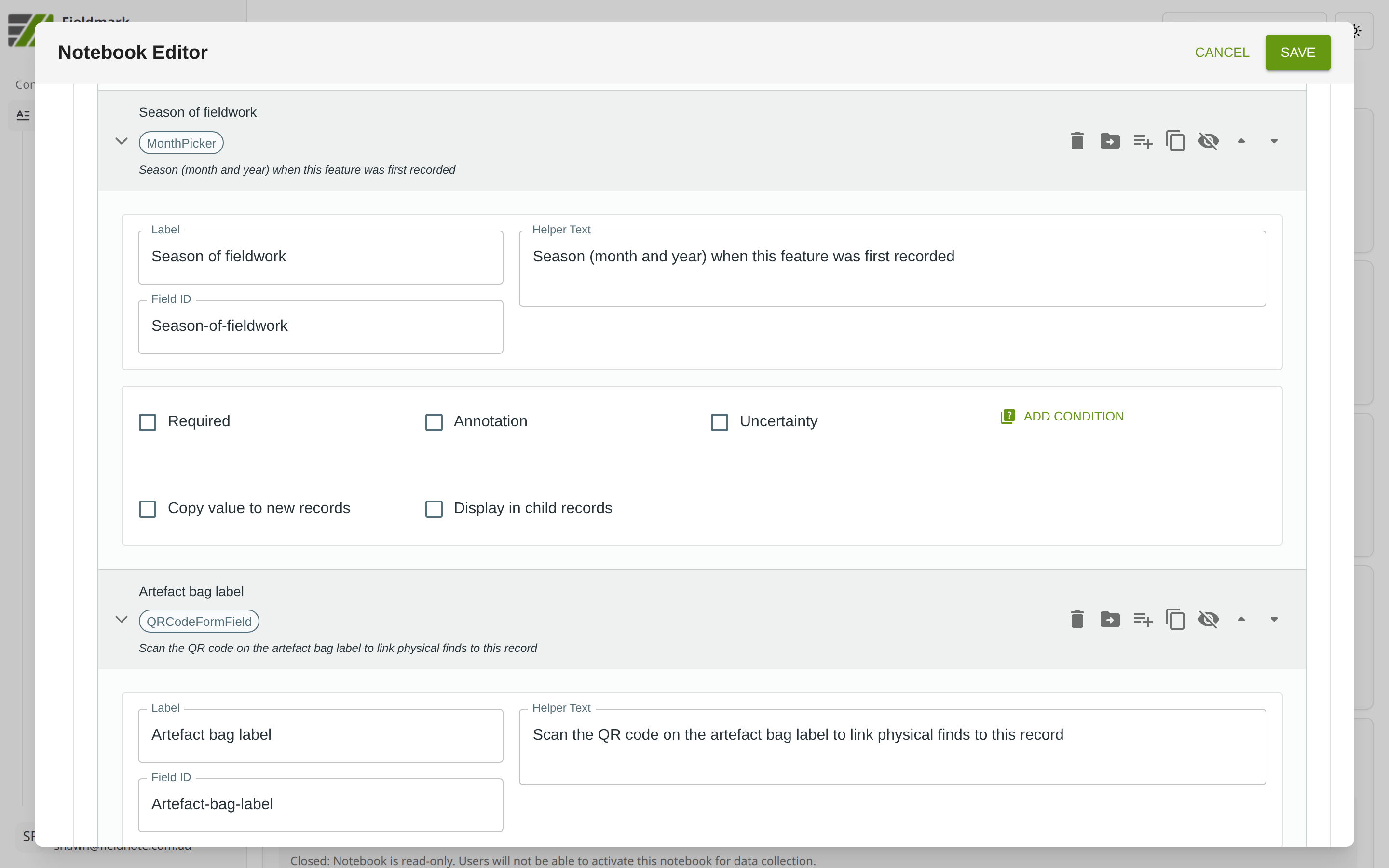 A Month Picker captures a year and month only (YYYY-MM), deliberately avoiding day-level precision. It is particularly valuable for historical documentation where exact dates are unknown or meaningless — preventing the common error of inventing precision where none exists. Use it for field seasons, publication dates, approximate dates of disturbance, or any temporal data where month-level granularity is appropriate.