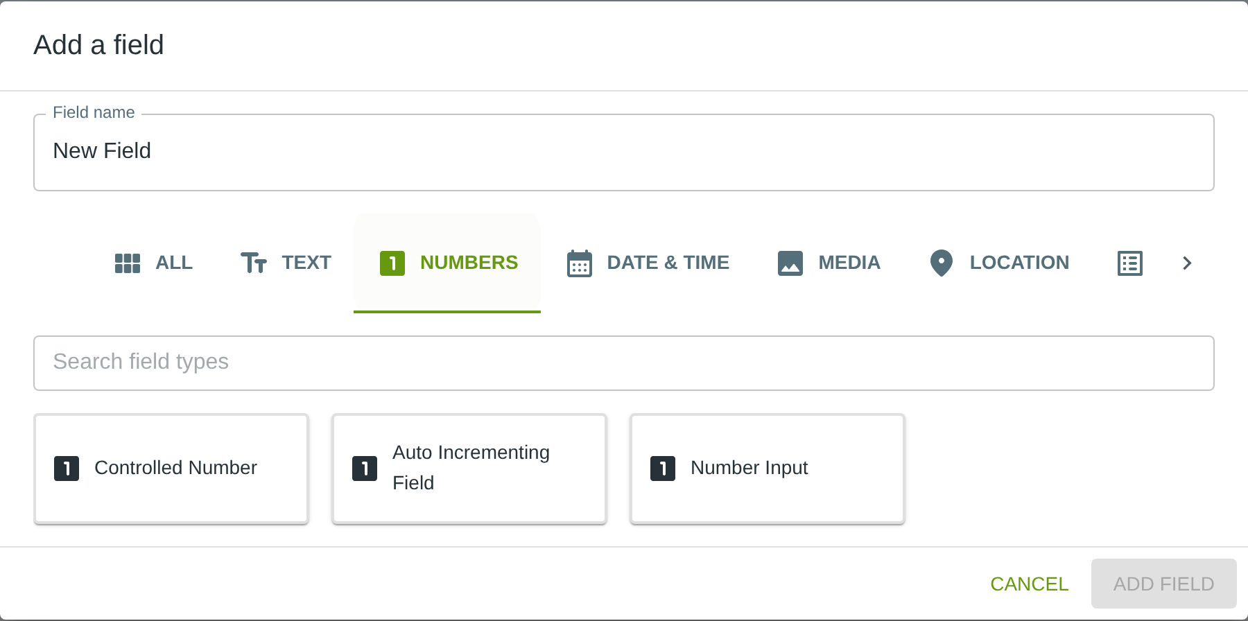 To add this field, open the ADD A FIELD dialog, navigate to the NUMBERS tab, and click the Controlled Number card. Then click the ADD FIELD button in the lower right.