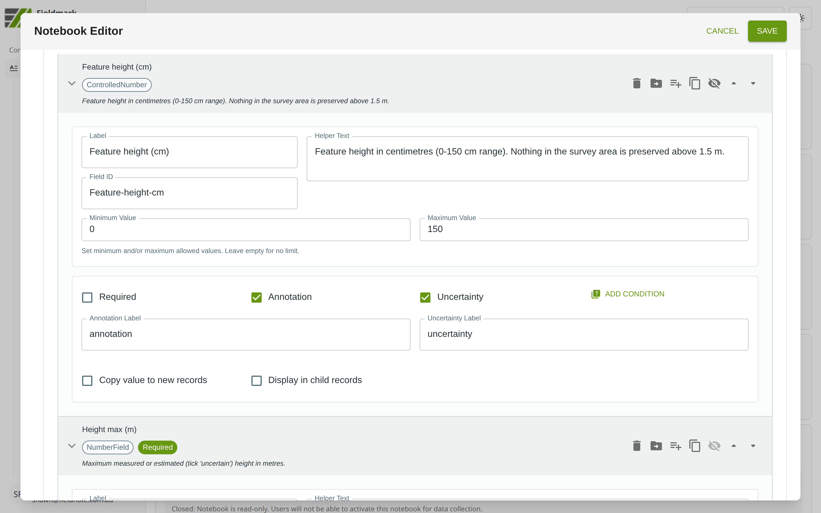 Enable Annotation and Uncertainty for measurement fields where collectors might need to note the instrument type, recording conditions, estimation method, or unexpected out-of-range values.