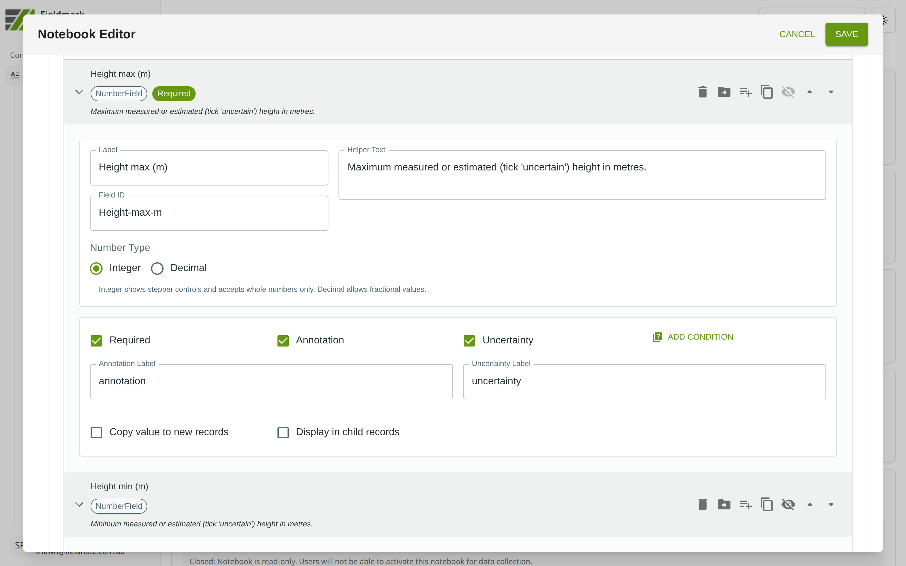 Enable Annotation and Uncertainty for measurement fields where collectors might need to note instrument type, recording conditions, measurement difficulties, or confidence.