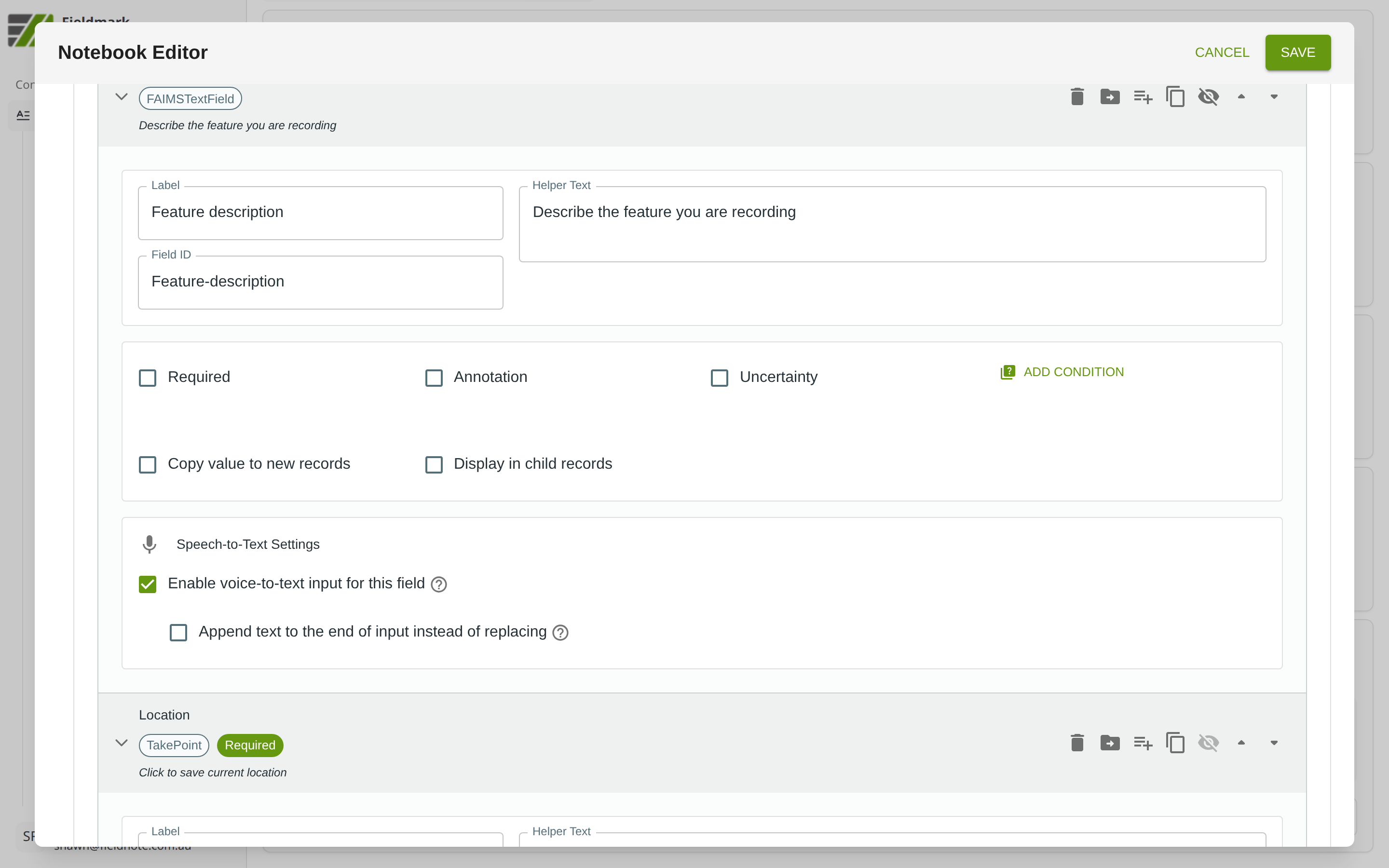 Shared options available on every field type in the Notebook Editor.