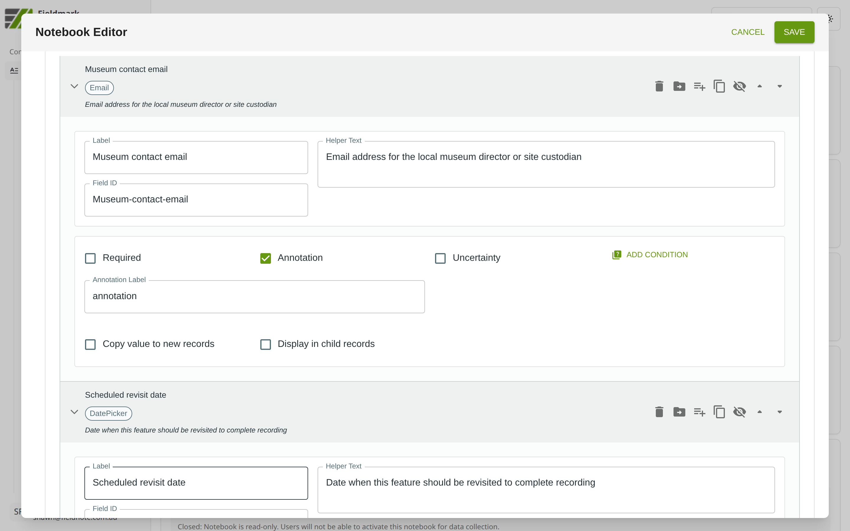 How to add and configure an Email field in the Notebook Editor.