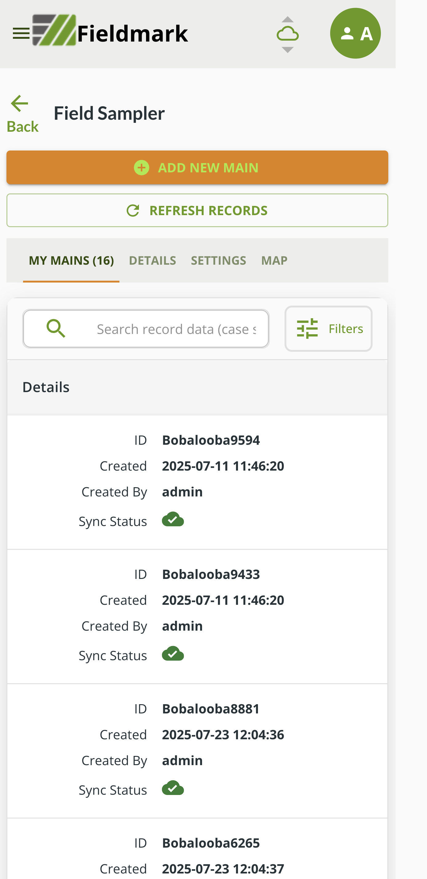 The list of records shows a few pieces of information about each record; this can be different in some notebooks depending on the configuration. You should at least see an identifier for the record, when it was created and by whom and the “Sync Status”; this last item will show a green cloud with a tick if the record is known to be saved on the server and an amber circle if upload is still pending.