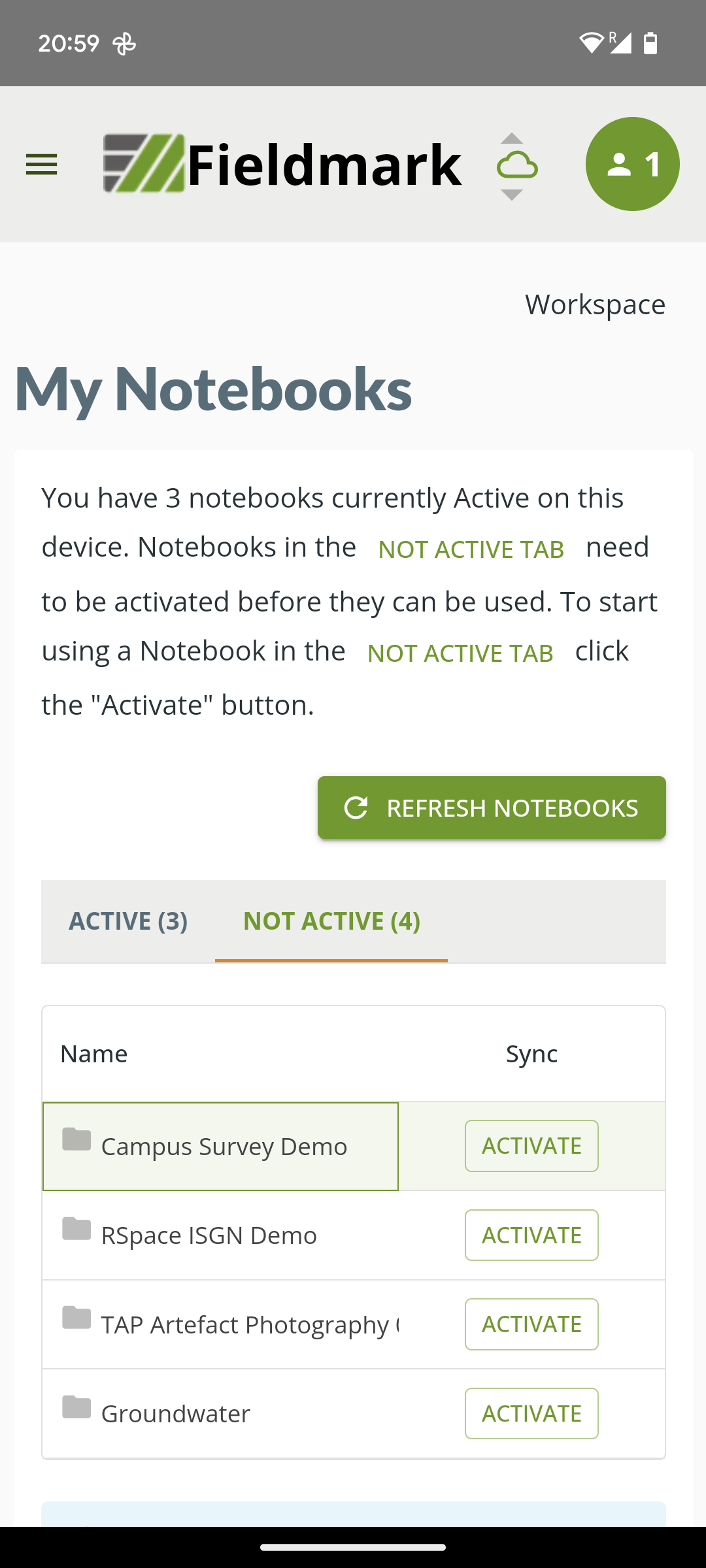 Once you have registered an account you will see the main workspace screen in the app that shows the notebooks that you have access to and those that you are working on. A notebook needs to be activated on your device in order for you to be able to collect data. You will see an initial screen showing active and not active notebooks with the notebook you have just gained access to in the not active list. Your first step is to activate this notebook on your device so you can work with it; to do this, click on the Activate button next to the notebook.