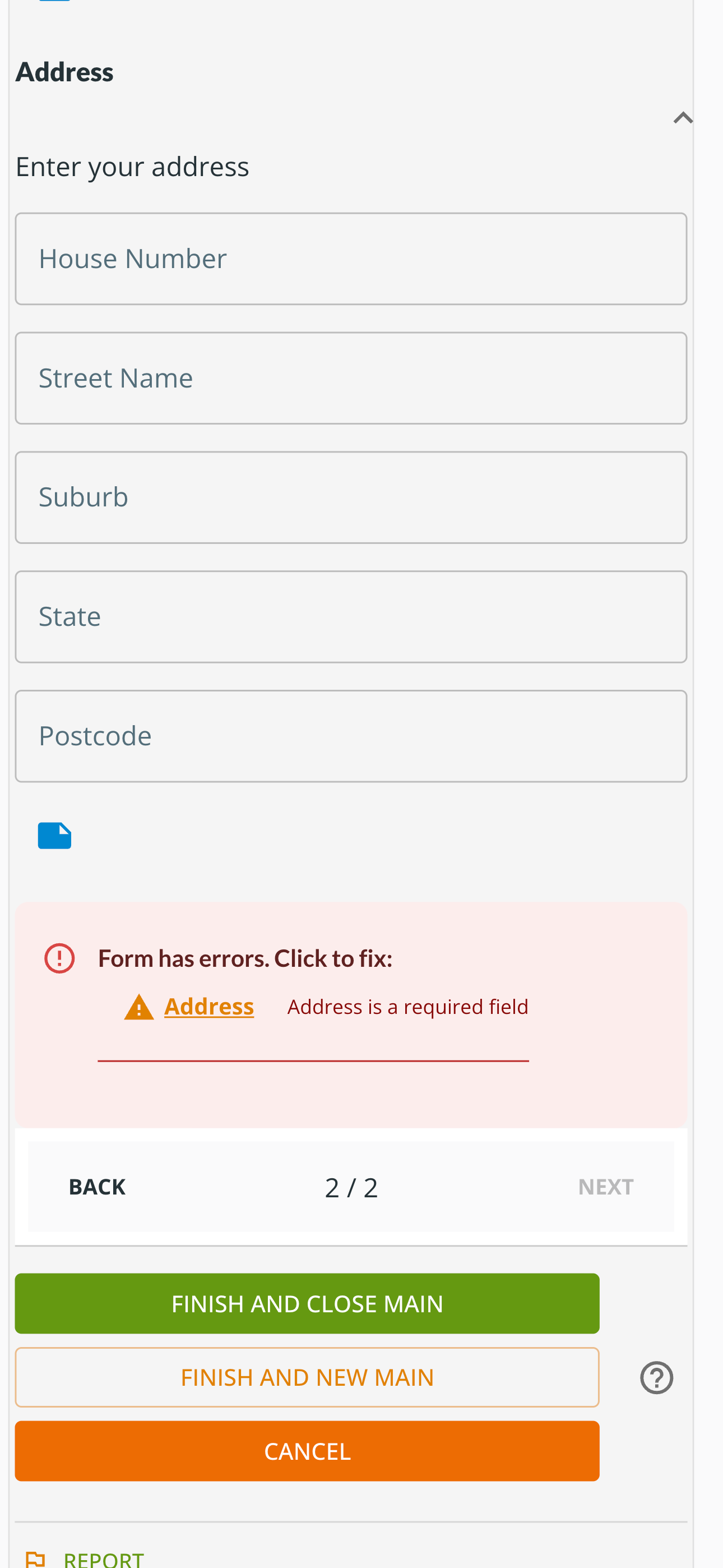As you complete the form and scroll to the end of the section, you will see the ‘Finish’ buttons as shown in this screenshot. Above this, you may see a warning as shown here if there are errors in the form - generally if you have missed entering some data. The error message should include a link that will scroll to the field that is missing. If the error is in a different section of the form, it will link you to that section.