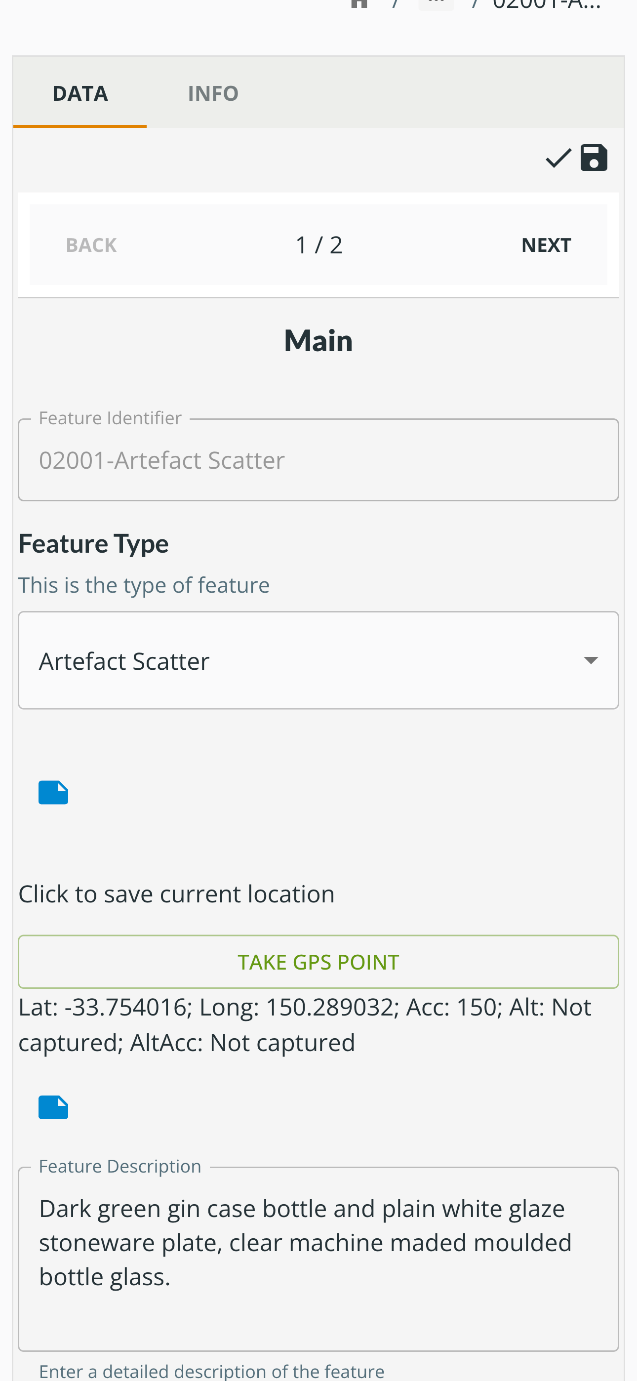 There are usually two tabs in a record form, ‘Data’ is where you will enter data, ‘Info’ provides some information about the record such as the name of the person who created it and the creation time. There is a third tab that can appear if there are conflicts between versions of this record, we’ll cover that later.