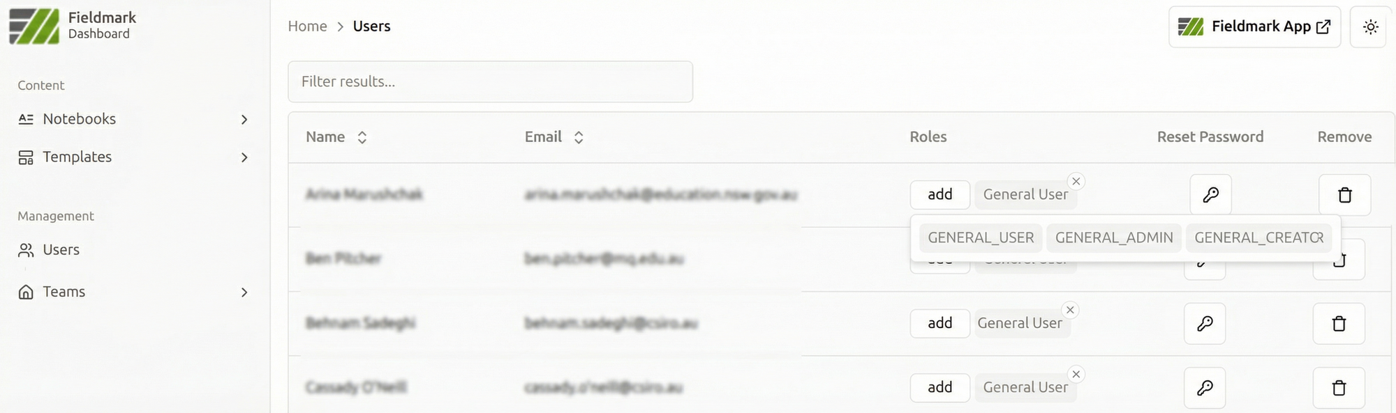 Fieldmark uses a role-based permissions system to control access to different functions and data. The model centres around access to resources: teams, user accounts, templates, notebooks, and the system as a whole.